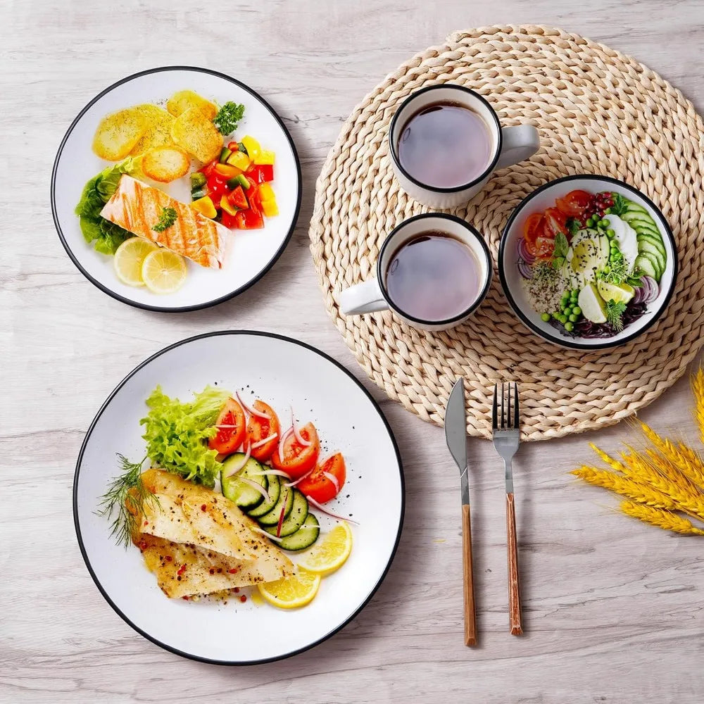 Elevate every meal with a timeless stoneware dinnerware set that blends everyday practicality with understated, modern appeal. This 16-piece service for four brings a cohesive, sophisticated look to casual dinners and entertaining, while staying durable enough for daily use. The matte white finish is accented by a distinctive black rim, delivering a clean, contemporary silhouette that complements any table setting.