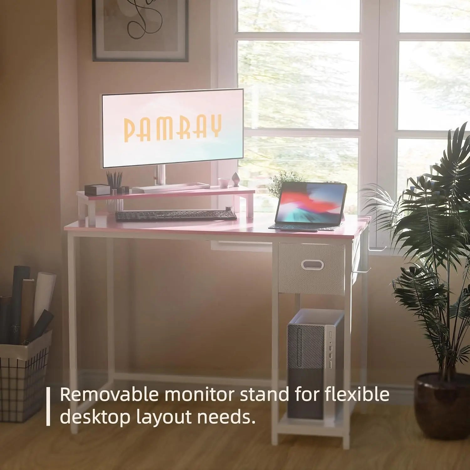 - Ample storage keeps your essentials within reach: a 0.59 cu ft non-woven drawer for small items, a 1.83 cu ft PC tower stand, and two hanging hooks to tame backpacks and headphones.