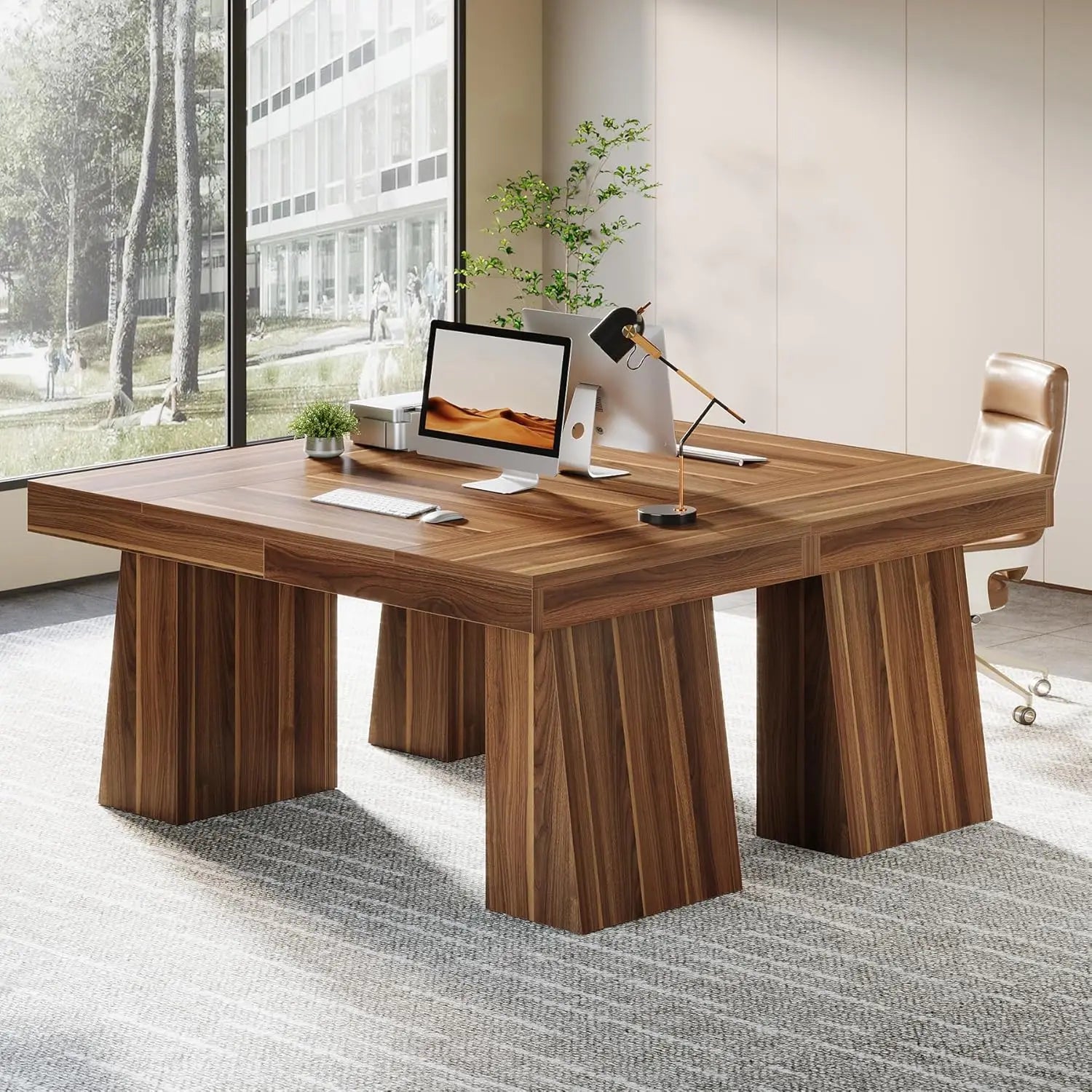 Elevate your workspace with a sleek executive desk that blends minimalist design with warm, natural wood tones for a timeless, productive vibe.