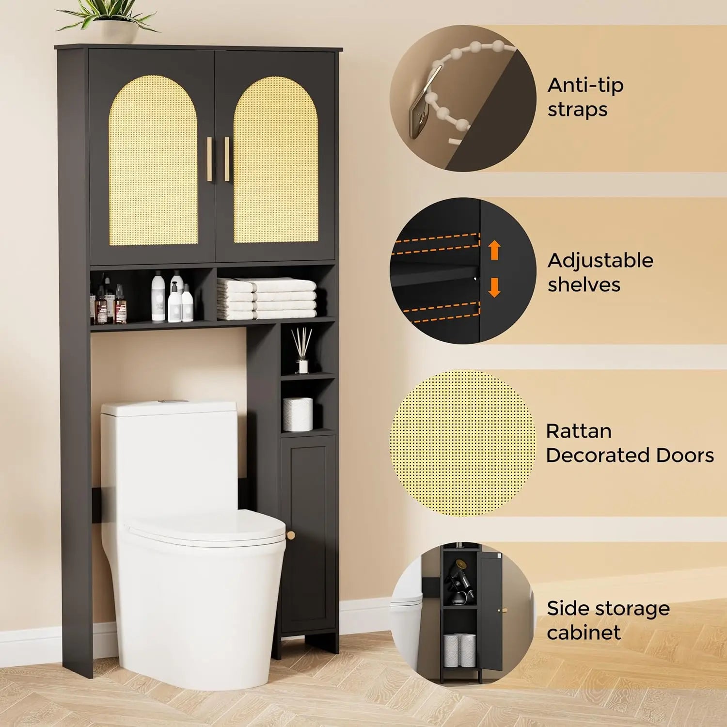 Elevate your bathroom with a tall, stylish over-toilet cabinet that combines space-saving storage with boho-chic flair.