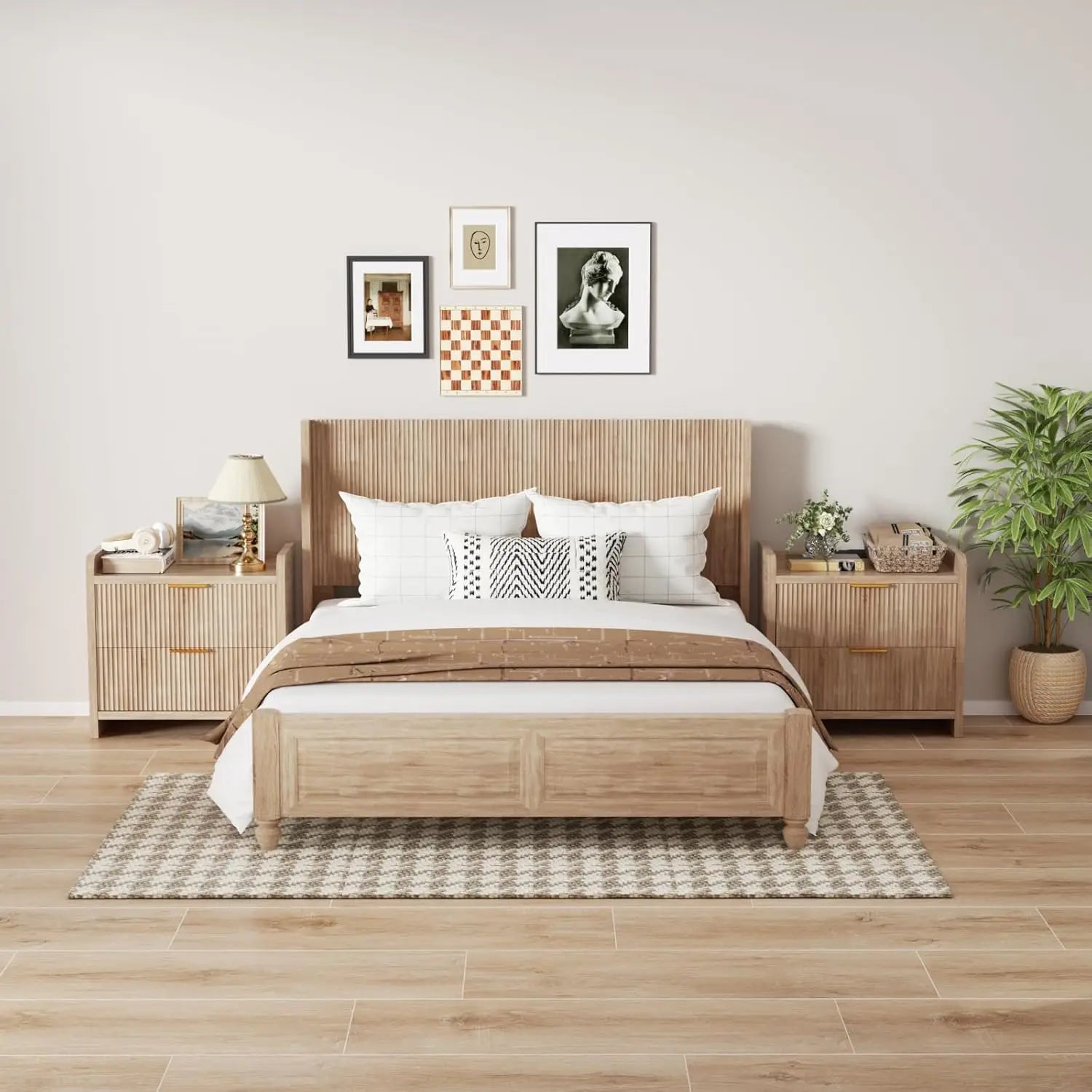 Transform your bedroom with a wall-mounted fluted wood headboard that anchors a rustic modern farmhouse look.